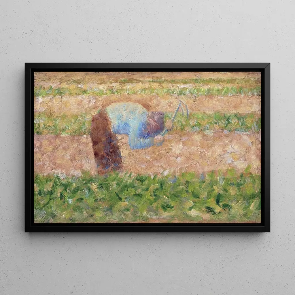 In this art print of Man with a Hoe, Georges Seurat immerses us in the peaceful world of farm workers. The canvas, created with the pointillism technique, stands out with its vibrant colors and delicate nuances. The shapes are subtly outlined, creating an atmosphere that is both serene and contemplative. The central figure, armed with his hoe, seems to embody the quiet strength of the peasant, while the surrounding landscape evokes a generous and welcoming nature. Seurat manages to capture the very essence of daily labor, transforming an ordinary scene into a moment of visual poetry.
