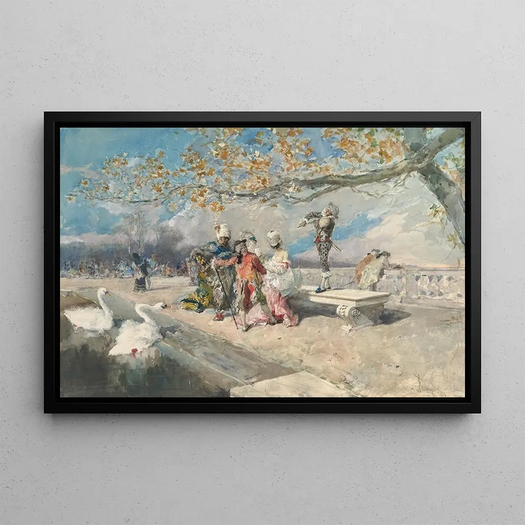 In "Mascarade," Mariano Fortuny Marsal captures the essence of a colorful celebration, where masked characters come to life under a soft, warm light. The rich hues of red, gold, and blue blend harmoniously, creating an atmosphere that is both festive and enigmatic. The artist's technique, combining realism and impressionism, brings every detail to life, from the flamboyant costumes to the expressions on the faces. This art print invites the viewer to immerse themselves in a world of joy and mystery, where each mask tells a story and every gesture evokes an emotion.