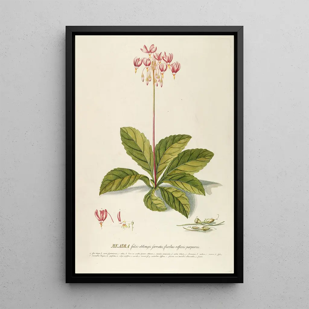 The art print of Meadia by Georg Dionysius Ehret is a true tribute to floral richness. This piece, created with remarkable botanical precision, reveals vibrant flowers with dazzling colors. The shades of green and pink intertwine harmoniously, creating an atmosphere of serenity and wonder. The watercolor technique, used with finesse, captures the delicacy of the petals and the brightness of the leaves, inviting the viewer to immerse themselves in a universe where nature is queen. Every detail is carefully rendered, demonstrating a deep love for the plant world.