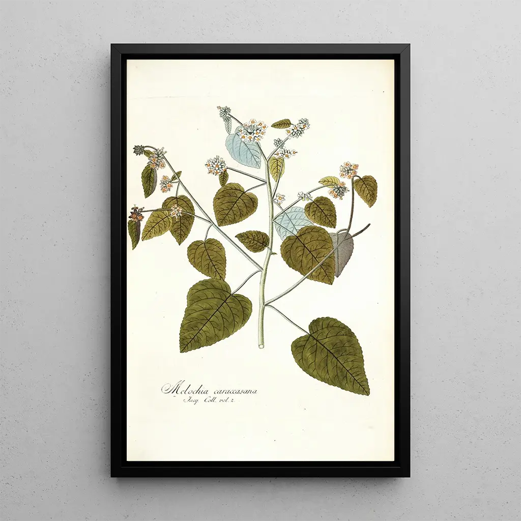 The art print of Melochia caraccasana, created by Nikolaus Joseph Freiherr von Jacquin, immerses us in a lush and vibrant botanical universe. This piece, characterized by its verdant hues and delicate shades of yellow, evokes the warmth of tropical climates. The watercolor technique, executed with finesse, pays tribute to the lightness and transparency of the leaves. The atmosphere emanating from this canvas is both soothing and inspiring, inviting the viewer to immerse themselves in the abundant nature and to appreciate the splendor of botanical details.