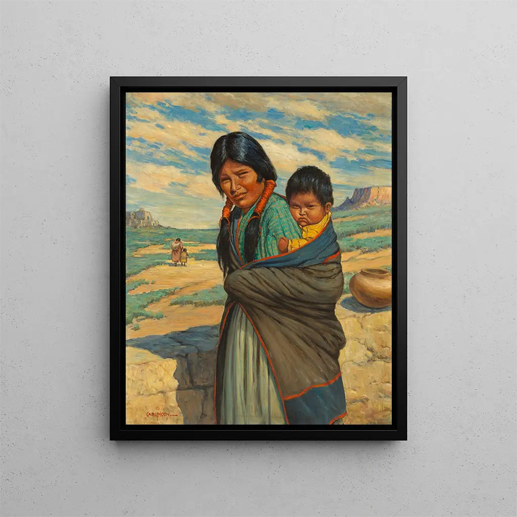In the fascinating world of art, some works transcend time and cultures, capturing moments of poignant beauty. "Mother and Hopi child - Carl Moon" is one of these creations that, through its simplicity and depth, evokes an intimate connection between the artist and their subject. This piece transports us to the heart of Hopi culture, an Indigenous people whose traditions and values are beautifully highlighted by Carl Moon's talent. Through his gaze, we discover a scene filled with emotion, where maternal tenderness blends with ancestral wisdom, offering a reflection on the sacred bond that unites generations. Style and uniqueness of the work The strength of "Mother and Hopi child" lies in its unique style, which combines realism and sensitivity. Carl Moon, known for his ability to capture the soul of his subjects, succeeds here in immortalizing a moment of everyday life. The warm colors, delicate textures, and soft light enveloping the mother-and-child duo create an atmosphere that is both peaceful and vibrant. Every detail, from the knowing look exchanged between the mother and her child to the traditional patterns adorning their clothing, tells a story rich in symbols. The piece does not merely depict a scene; it invites the viewer to feel the depth of maternal love and the beauty of Hopi traditions, while celebrating the strength of motherhood. The artist and his influence Carl Moon, photographer and painter of the early 20th century, established himself as a pioneer in the representation of Indigenous cultures. His work is marked by a deep respect for the subjects he immortalizes, and "Mother and Hopi child" is a perfect illustration of this. Moon spent many years living among the Hopis, learning their customs and beliefs, which allowed him to create authentic works imbued with truth. His influence is palpable not only in the art world but also in how he helped raise awareness of the richness of Indigenous cultures. Through his gaze, he reminds us of the importance of preserving these traditions and celebrating cultural diversity.