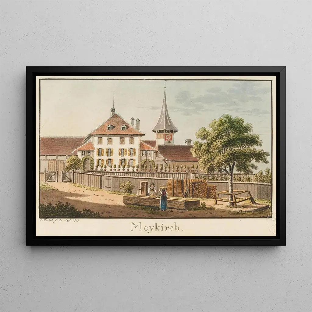 The art print "Meykirch" by Jakob Samuel Weibel transports us to a charming and tranquil rural landscape. This canvas depicts a bucolic scene where nature and architecture blend harmoniously. The soft, earthy colors, combined with touches of green and blue, create a calming, almost nostalgic atmosphere. The composition highlights elements of everyday life, inviting the viewer to immerse themselves in the simple beauty of these frozen moments in time. "Meykirch" is an ode to rural life, celebrating the beauty of landscapes and traditions.