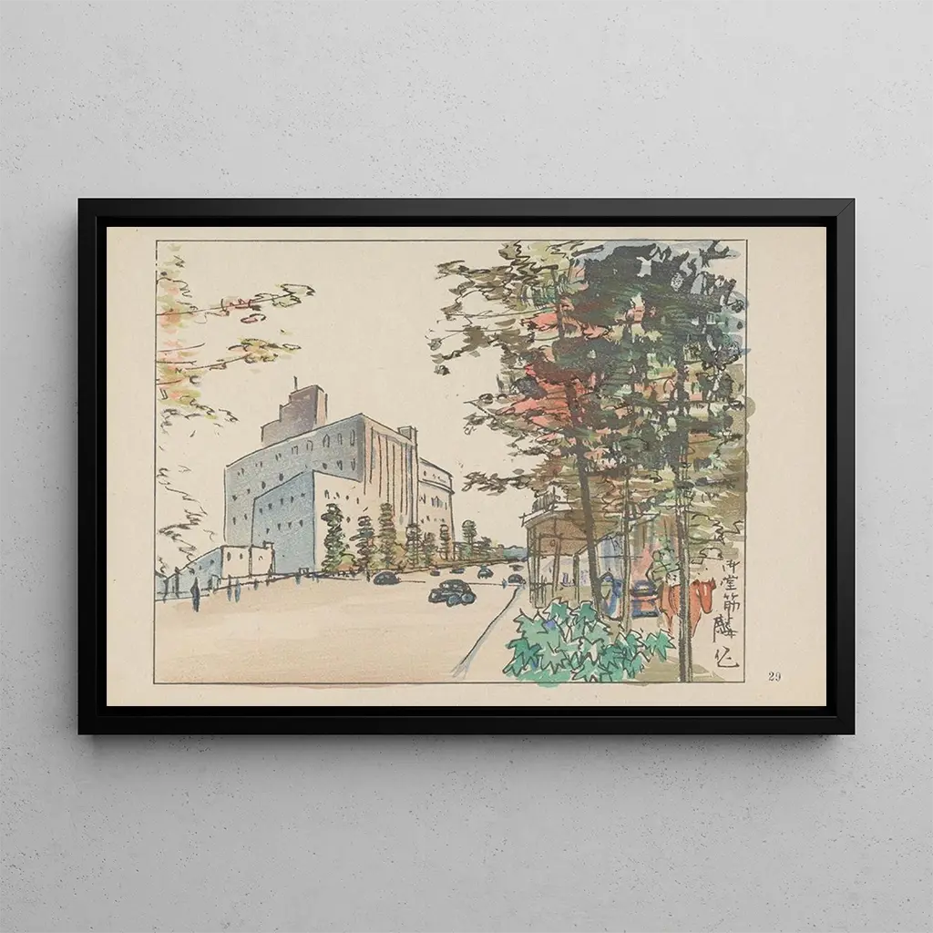 The art print "Midosuji, a business district" by Akamatsu Rinsaku depicts a vibrant city scene, where modern architecture blends with the hustle and bustle of urban life. The clean lines of the buildings, accentuated by bright and contrasting colors, create a dynamic and energetic atmosphere. Rinsaku employs a mixed technique combining painting and graphic elements, adding visual depth to this representation. The movement of passersby, captured with precision, brings this metropolis to life, inviting the viewer to immerse themselves in the vibrancy of everyday life.