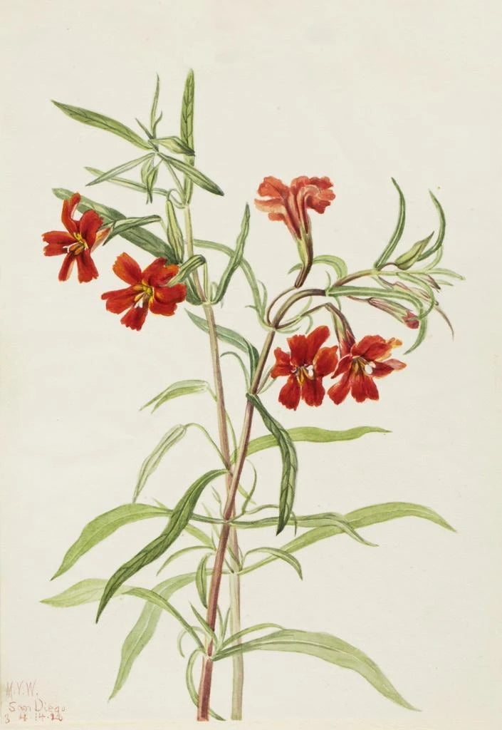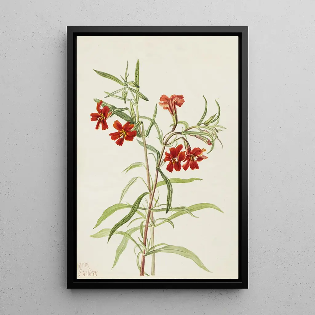 The art print "Mimule rouge" by Mary Vaux Walcott evokes the delicate beauty of nature through a palette of bright colors. Shades of red, green, and yellow blend harmoniously, creating a lively and joyful atmosphere. The watercolor technique, mastered by the artist, captures the lightness and transparency of the petals, while adding a subtle depth to the piece. Each brushstroke seems to tell a story, inviting the viewer to immerse themselves in a world where flora blooms with grace.