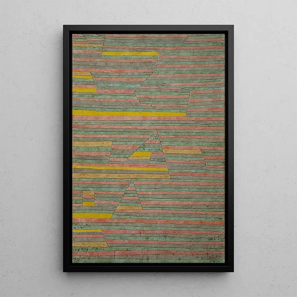 The art print of "Monuments à G" is an ideal decorative choice for various spaces such as the living room, office, or bedroom. With its bright colors and intriguing shapes, this piece draws the eye and sparks curiosity. The quality of the reproduction guarantees remarkable fidelity to the original work, allowing you to enjoy all the visual richness of Klee in your interior. By integrating this canvas into your decor, you bring a touch of originality and creativity, while benefiting from an aesthetic asset that will undoubtedly spark conversations and enrich the atmosphere of your living space.