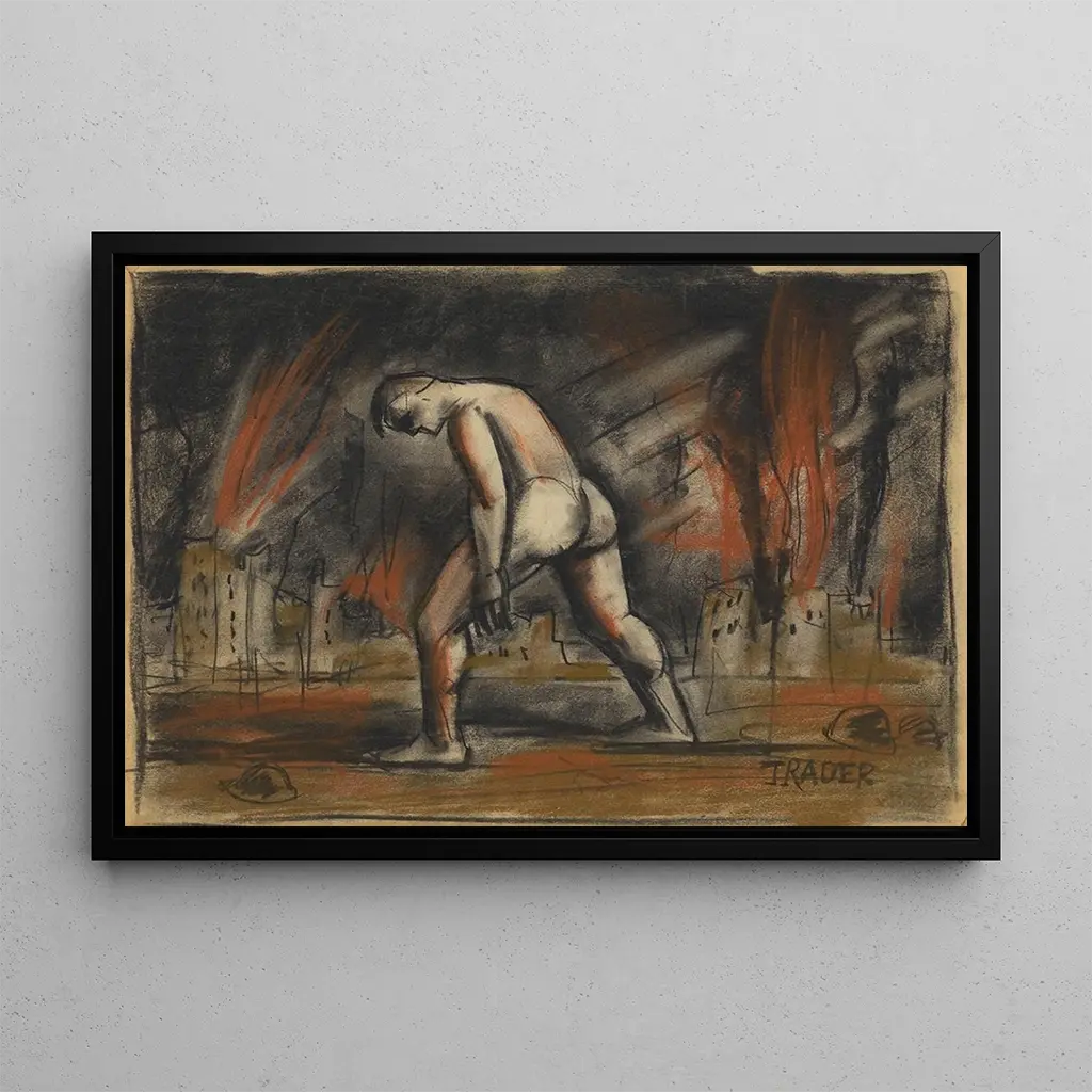 In "Mourning," Karl Wiener captures with emotional intensity the sadness and loss. This artwork stands out for its use of dark colors and stylized shapes, creating an atmosphere heavy with melancholy. The human figures, often depicted in contemplative poses, convey a sense of despair and reflection. Wiener's technique, which blends realism with a symbolic approach, allows one to feel the depth of human emotion in the face of death and suffering.