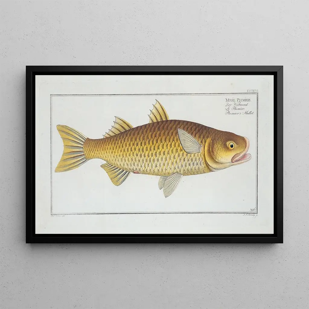The art print of Mugil Plumeri, the Grey Mullet of Plumer, immerses us in the aquatic world through the precision and realism of Marcus Elieser Bloch. This piece highlights the mullet, an iconic fish, depicted with meticulous attention to anatomical details. The shades of blue and green evoke the depths of the sea, while the light plays on the scales, creating a captivating shimmering effect. Bloch's technique, blending watercolor and engraving, pays tribute to the beauty of underwater fauna, offering a view that is both scientific and artistic of this animal.