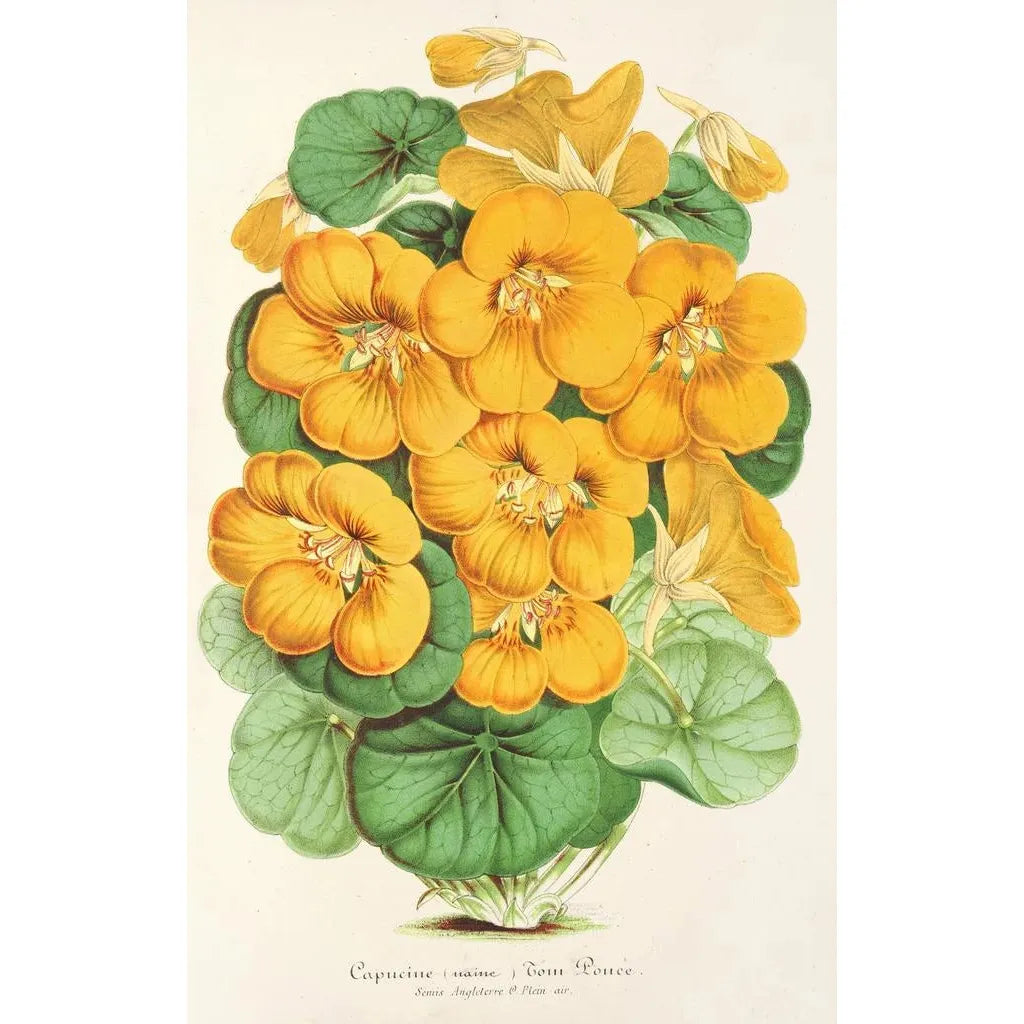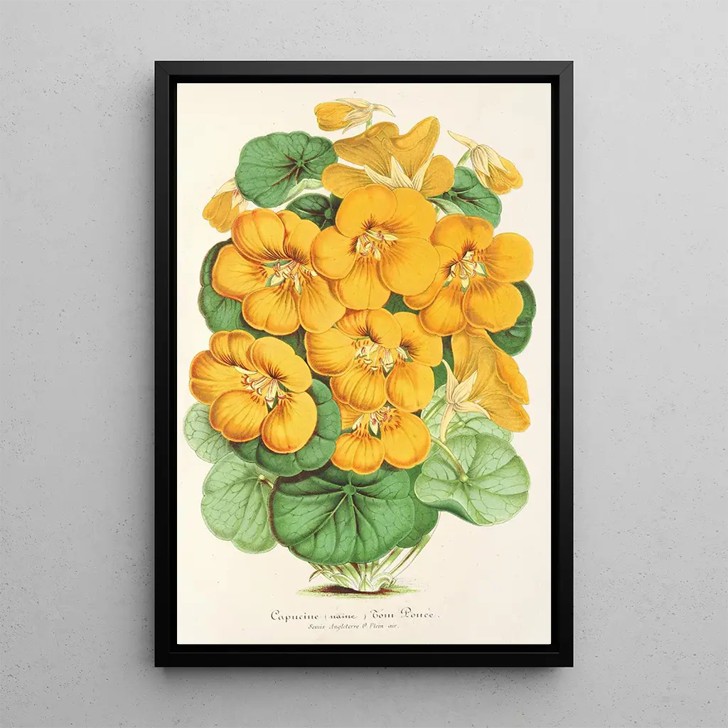The art print of Capucine Tom Pouce, a work by Charles Antoine Lemaire, immerses us in a universe where nature flourishes with grace. The pastel shades of the petals, combined with touches of tender green, create a soft and soothing atmosphere. Lemaire, with his meticulous technique, manages to capture the lightness and fragility of this iconic flower. Every detail, from the veins of the leaves to the light reflections on the petals, is carefully rendered, inviting the viewer to attentive contemplation. This canvas evokes a sense of serenity, like a breath of fresh air in a secret garden.