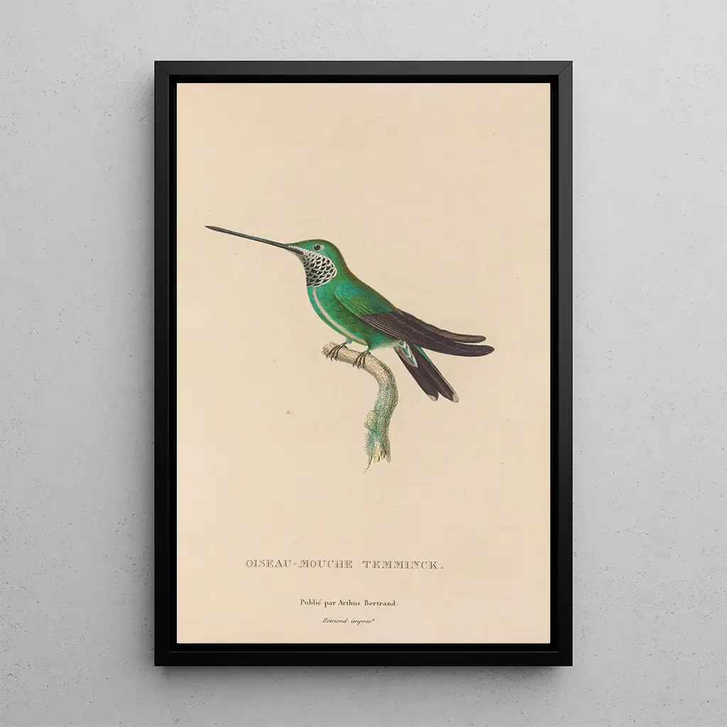 La reproduction de "Histoire naturelle des oiseaux-mouches Pl20" de René Primevère Lesson nous transporte dans un univers où chaque oiseau est une œuvre d'art à part entière. Les illustrations, finement détaillées, mettent en avant la diversité des espèces, chacune avec ses nuances de couleurs et ses particularités. Les teintes éclatantes, allant des bleus profonds aux jaunes lumineux, créent une atmosphère joyeuse et vivante. La technique de gravure de Lesson, alliant précision et délicatesse, permet de ressentir la légèreté de ces oiseaux-mouches, rendant cette œuvre à la fois captivante et inspirante.