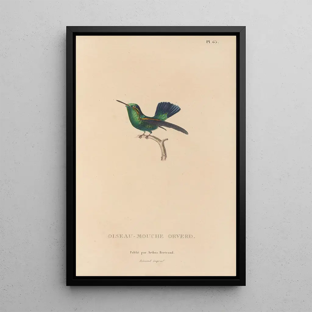 Histoire naturelle des oiseaux-mouches Pl66 : an homage to the lightness of wings The art print Histoire naturelle des oiseaux-mouches Pl66 evokes the lightness and elegance of these fascinating birds. The vibrant colors and meticulous details of this piece capture the very essence of these aerial creatures, which seem to float in a world of beauty. René Primevère Lesson's engraving technique allows each feather to be rendered with remarkable precision, creating an almost magical atmosphere. This canvas invites escape, discovery of a universe where nature and art meet to celebrate the splendor of avian fauna. René Primevère Lesson: an artist at the crossroads of art and science René Primevère Lesson, naturalist and illustrator, played a key role in documenting species in the 19th century. His work is set in a time when interest in nature and science was booming, influenced by explorations and scientific discoveries. Lesson knew how to combine scientific rigor with artistic sensitivity, offering a unique vision of biodiversity. His illustrations, including Histoire naturelle des oiseaux-mouches, are not only works of art but also significant contributions to ornithology, making him a major figure in naturalist illustration. A decorative acquisition with multiple assets The art print Histoire naturelle des oiseaux-mouches Pl66 is a decorative piece that will enrich your interior, whether in a living room, office, or bedroom. Its print quality and attention to detail make it an ideal choice for art and nature enthusiasts. With its captivating aesthetic, this canvas adds a touch of color and life to your space, while evoking the delicate beauty of hummingbirds. By choosing this artwork, you select a piece that not only enhances your decor but also invites reflection on the richness of our natural environment.