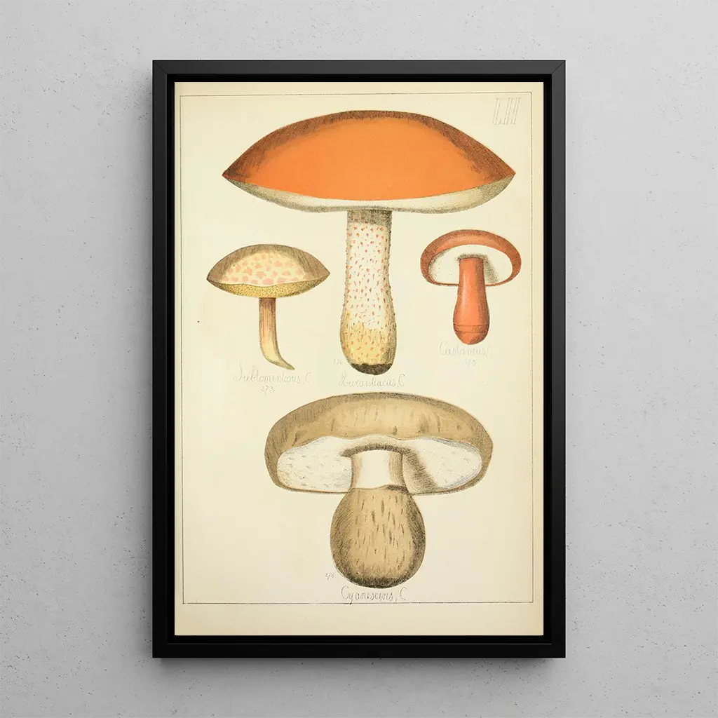 In this art print of Histoire naturelle des champignons Pl52, artist Guillaume Sicard immerses us in a universe where nature reveals itself with remarkable precision. The vibrant colors and meticulous details of the mushrooms capture the eye and invite attentive contemplation. The watercolor technique, combined with precise drawing, creates an atmosphere that is both scientific and poetic, where each species seems to tell its own story. The harmonious composition, with mushrooms arranged in a balanced manner, evokes a symbiosis between art and science, paying tribute to the beauty of the natural world. Guillaume Sicard: a pioneer of botanical illustration Guillaume Sicard, active in the 18th century, is recognized for his contributions to botanical illustration, particularly in the field of mycology. His work is set in a period when the study of plants and fungi was taking on new scope, with growing interest in scientific classification. Influenced by the discoveries of his contemporaries, Sicard was able to combine scientific rigor with artistic sensibility, making his works references in the field. His methodical approach and attention to detail have made it possible to make accessible the beauty and diversity of mushrooms, while contributing to the scientific knowledge of his time. A decorative piece with multiple assets The art print of Histoire naturelle des champignons Pl52 is a decorative item that will enrich any interior, whether in a living room, office, or bedroom. Its faithful print quality and aesthetic appeal make it an ideal choice for lovers of nature and science. By integrating this canvas into your decor, you bring a touch of elegance and curiosity, while sparking conversations about the beauty of mushrooms. This painting, both educational and decorative, is a true invitation to explore the fascinating world of mycology while enhancing your living space.