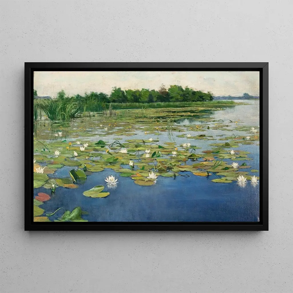 Henryk Weyssenhoff's Water Lilies capture the essence of a peaceful pond, where light plays on the water surfaces. This art print, rich in shades of green and blue, evokes a serene and contemplative atmosphere. The delicate flowers, gracefully floating on the surface, seem to invite the viewer to immerse themselves in this idyllic landscape. The artist's technique, blending impressionism and realism, gives the work a depth that transcends mere natural scenery, transforming each brushstroke into a celebration of ephemeral beauty.