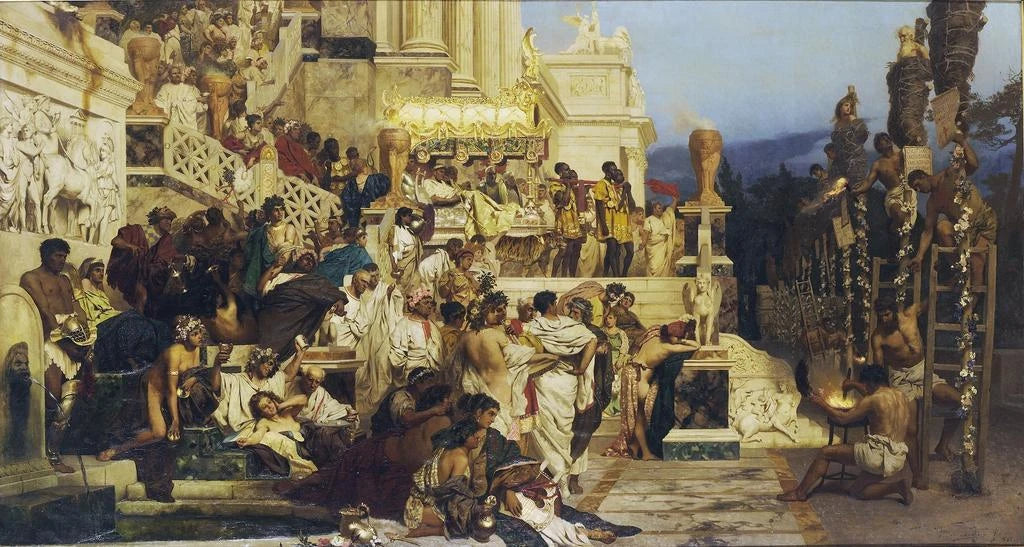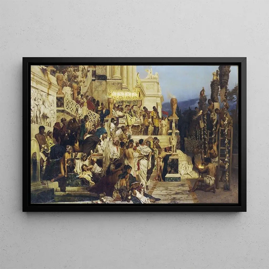 Nero's Torches: A Historical Drama in Light " Nero's Torches" by Henryk Siemiradzki is a striking artwork that immerses the viewer in a dramatic scene from antiquity. The canvas, rich in vivid colors and contrasts, depicts human figures illuminated by torches, creating an atmosphere that is both festive and tragic. The meticulous details of the costumes and facial expressions reveal Siemiradzki's talent for capturing emotion and movement. The dynamic composition, with lines guiding the eye, evokes a powerful narrative where light and shadow play a crucial role in visual storytelling. Henryk Siemiradzki: A Virtuoso of Neoclassicism Henryk Siemiradzki, a Polish painter of the 19th century, is renowned for his neoclassical works that combine academic rigor with artistic sensitivity. Trained at the Saint Petersburg Academy of Fine Arts, he was influenced by Renaissance and Baroque masters, which is reflected in his elaborate style. Siemiradzki mastered capturing historical moments with remarkable precision, paying homage to the grandeur of antiquity. "Nero's Torches" perfectly illustrates his ability to fuse history and art while exploring universal themes such as passion and power. A Decorative Acquisition with Multiple Assets The art print of "Nero's Torches" makes a captivating addition to your interior decor, whether in a living room, dining room, or office. Its visual intensity and historical narrative make it an ideal focal point to spark conversations. The quality of the art print ensures fidelity to the original work, allowing appreciation of every nuance and detail. By integrating this piece into your space, you add a touch of elegance and culture to your interior, while celebrating the artistic heritage of a great master.