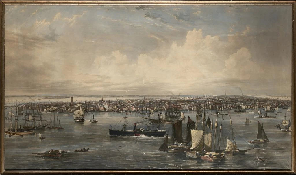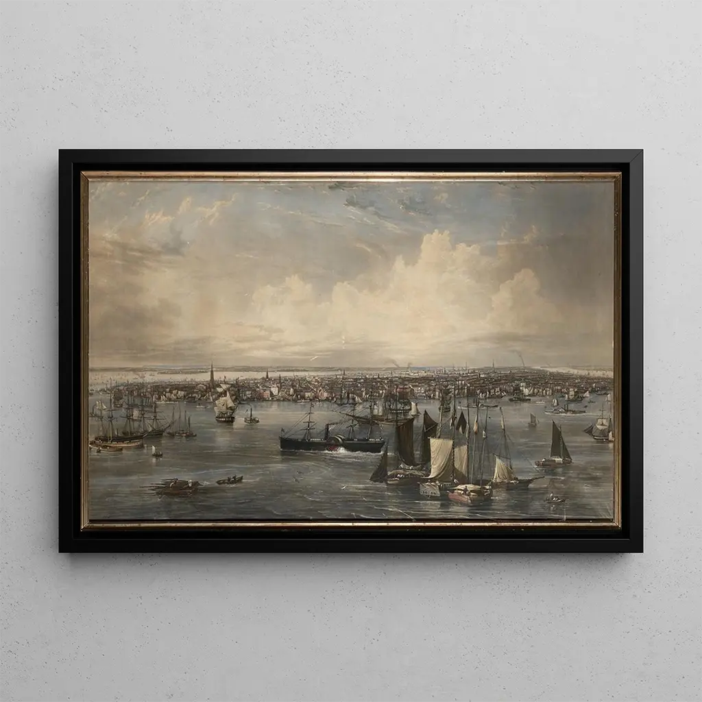 In this iconic artwork, John William Hill depicts the city of New York with striking accuracy. The painting, rich in detail, reveals the hustle and bustle of the streets and the majestic architecture of the buildings. The vivid colors and dynamic contrasts evoke the vibrant energy of the metropolis, while the moving characters add a human dimension to this urban scene. The atmosphere is both modern and nostalgic, capturing the essence of a city in constant evolution.