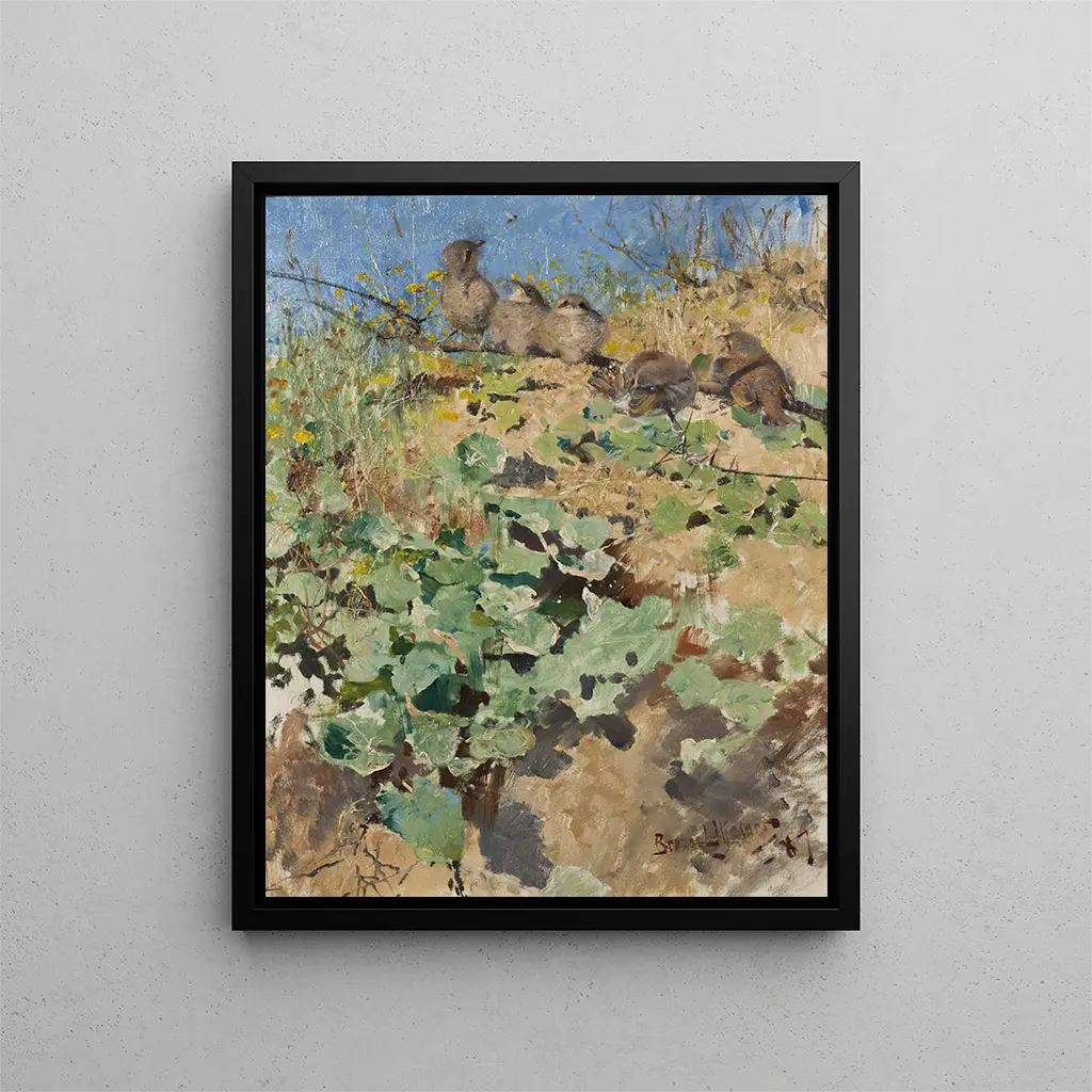 Le style de Liljefors est caractérisé par un mélange harmonieux de réalisme et d'impressionnisme, où chaque coup de pinceau semble raconter une histoire. Dans "Nids de pie-grièche écorcheur", la lumière joue un rôle central, illuminant les plumes délicates de l'oiseau tout en créant des ombres subtiles qui ajoutent de la profondeur à la scène. La palette de couleurs, riche et nuancée, évoque la chaleur des paysages nordiques, tandis que la précision des détails, des brins d'herbe aux textures des plumes, témoigne d'une observation minutieuse de la nature. Liljefors parvient ainsi à capturer non seulement l'apparence physique de ses sujets, mais aussi leur essence, leur caractère. Cette œuvre est une véritable ode à la vie sauvage, où chaque élément contribue à une composition équilibrée et harmonieuse.