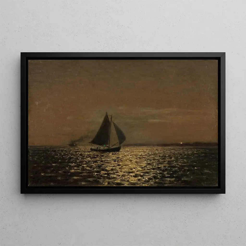 In this art print of Atmosphere Nocturne at Hvaler, Amaldus Nielsen transports us to a world of nocturnal serenity. The shades of deep blue and black blend harmoniously, creating a soothing atmosphere. The silvery reflections of the moon dance on the waves, while the silhouettes of boats are delicately outlined on the horizon. Nielsen's technique, which combines realism with a touch of impressionism, allows the artwork to breathe a certain magic. Each brushstroke seems to capture a fleeting moment, an invitation to escape into this maritime scene.