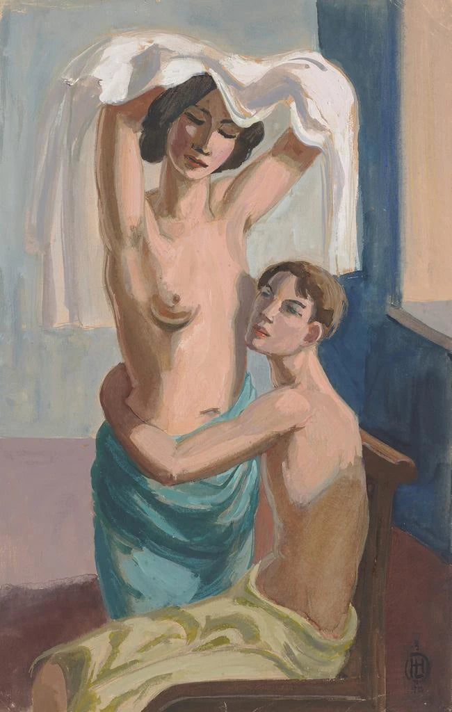 Art print | Sitting nude man embracing a standing nude woman - Hermann Lismann