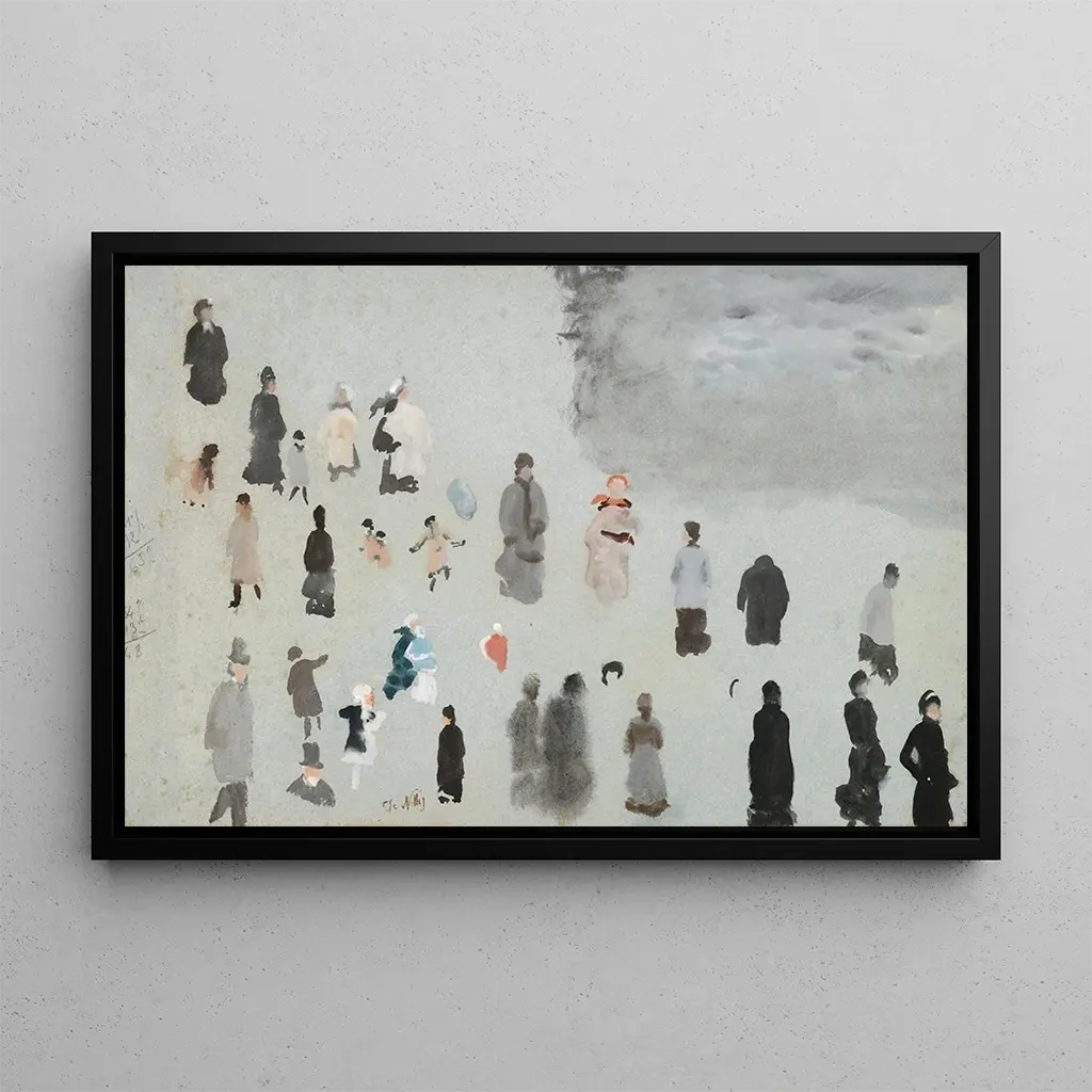 In "On the roads of Paris," Giuseppe De Nittis captures the vibrant essence of the French capital. This painting, bathed in light, immerses us in a lively scene where passersby mingle with carriages on the wet cobblestones. The warm colors and play of shadows create a lively and dynamic atmosphere, while the impressionist technique of the artist brings every detail to life. The quick, fluid brushstrokes evoke the movement and energy of the city, inviting the viewer to feel the buzz of Paris at the end of the 19th century.