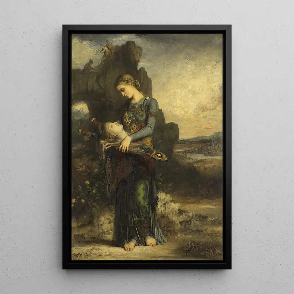 Orphée: an art print visual melody of the soul In "Orphée," Gustave Moreau captures the very essence of music and poetry through a vibrant representation of the famous mythological hero. The canvas, rich in colors and details, evokes an atmosphere that is both melancholic and enchanting. The shimmering hues, ranging from deep blue to golden shades, create a striking contrast that draws the eye. The dynamic composition, where Orphée appears to play the lyre, transports the viewer into a world where art and nature meet, thus revealing the power of human creativity in the face of adversity. Gustave Moreau: the artist of dreams and myths Gustave Moreau, born in 1826, is an emblematic artist of the symbolist movement, whose work explores themes of mythology and imagination. His training at the École des Beaux-Arts in Paris and his travels in Italy profoundly influence his style, which blends romanticism and decorative elements. Moreau stands out for his ability to transform mythological stories into poetic paintings, where every detail has meaning. "Orphée" is a perfect illustration of this approach, where the figure of the musician becomes a symbol of art and transcendence, while fitting into a rich artistic context full of innovations. A decorative acquisition with multiple assets The art print of "Orphée" is a decorative choice that will add a touch of elegance and sophistication to your interior. Whether in a living room, office, or bedroom, this canvas attracts attention and inspires admiration. Its printing quality guarantees fidelity to the colors and details of the original work, allowing you to fully enjoy the beauty of this creation. By integrating this art print into your space, you create an inspiring atmosphere while paying tribute to one of the most influential artists of his time.