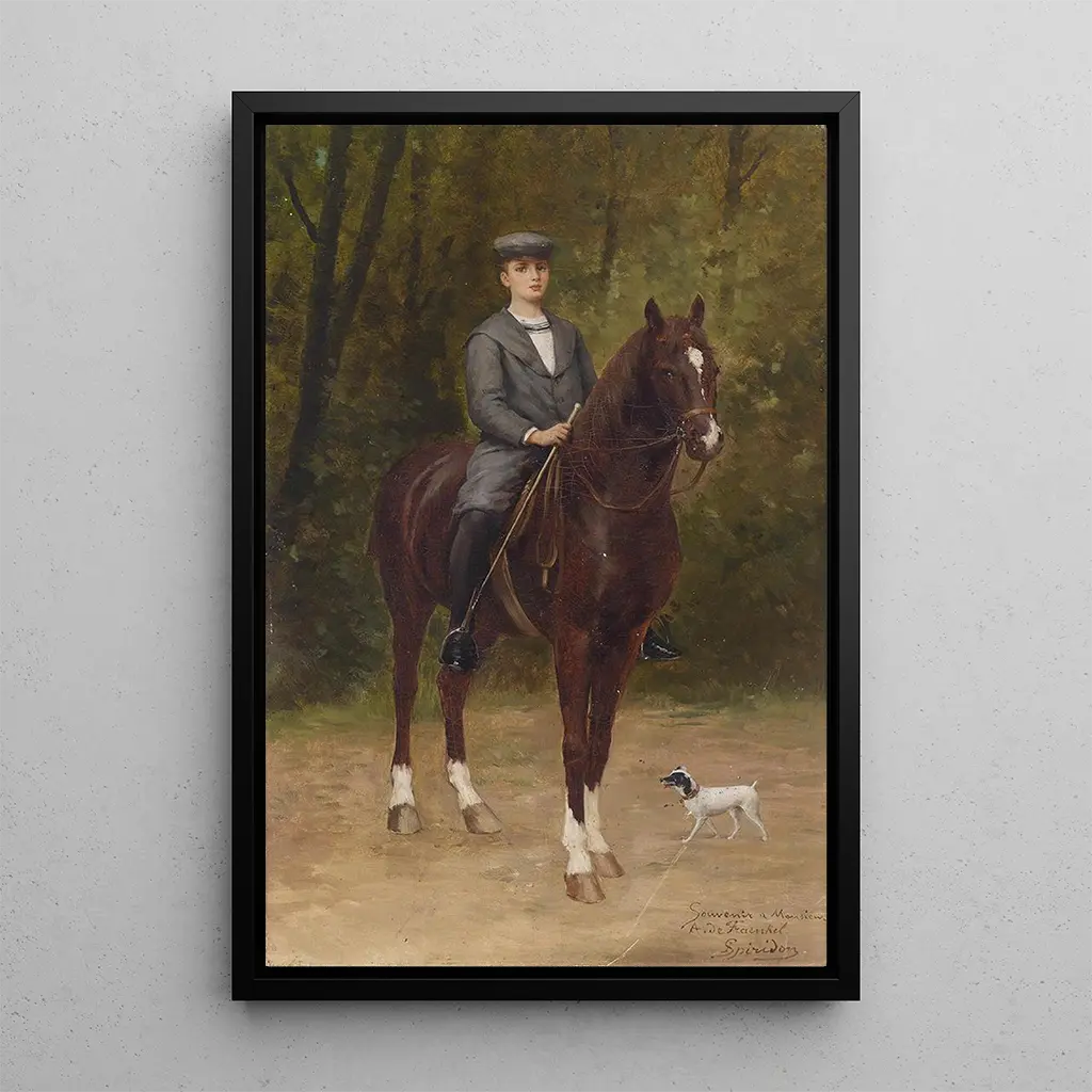 The art print "Oskar von Fraenkel on horseback" by Ignace Spiridon captures a moment of grace and power. The canvas, rich in detail, depicts a man in riding attire, majestically mounted on a galloping horse. The warm colors, blending deep browns and golden highlights, create a dynamic and lively atmosphere. Spiridon's technique, which combines realism and impressionist touches, allows you to feel the movement and energy of the scene. Each brushstroke seems to vibrate, evoking the rider's passion and the nobility of the animal.