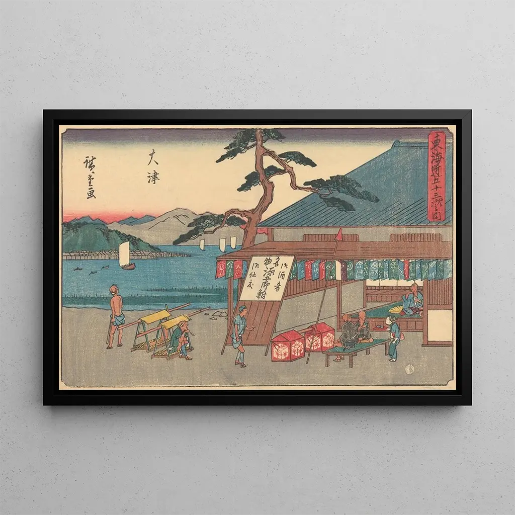 Andō Hiroshige, one of the greatest masters of ukiyo-e prints, left a mark on the 19th century with his poetic representations of nature and urban life in Japan. Influenced by the artistic movement of his time, he skillfully combined tradition and innovation, creating works that capture the ephemeral essence of the seasons and everyday moments. Hiroshige traveled across the country, drawing inspiration from the landscapes he encountered, and "Ōtsu" is a perfect example of his talent for immortalizing the beauty of traditional Japan. His works continue to inspire artists and art lovers around the world.