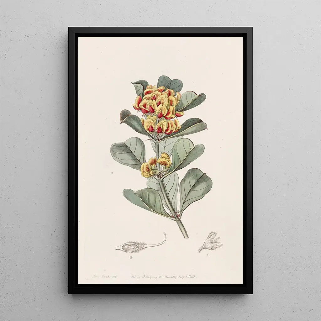 The art print "Oxylobium with corner leaves" is an ideal choice to enhance your interior, whether in a living room, office, or bedroom. Its printing quality ensures remarkable fidelity to the colors and details of the original artwork. This piece adds a touch of freshness and nature to your decor, while also impressing your guests. With its undeniable aesthetic appeal, this canvas fits perfectly into various interior styles, adding a note of elegance and serenity to your living space.