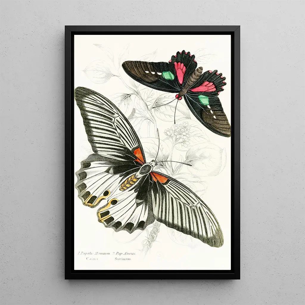 Papilio Memnon Pap Aeneas : a dance of colors and shapes In this art print of the painting "Papilio Memnon Pap Aeneas," artist James Duncan immerses us in a vibrant universe where butterflies come to life. The dazzling shades of blue, green, and orange blend harmoniously, creating an atmosphere that is both joyful and delicate. The watercolor technique, used with finesse, captures the lightness of these majestic insects' wings. Every detail is carefully rendered, from the intricate patterns on the wings to the subtle shadows that add depth to the composition. This art print invites serene contemplation, where one can almost hear the whisper of moving wings. James Duncan: a pioneer of naturalist art James Duncan, active in the 19th century, is recognized for his meticulous and scientific approach to insect representation. Influenced by the discoveries of his time, he skillfully combined art and science, paying homage to the beauty of nature. His works, often inspired by real specimens, demonstrate attentive observation and a deep respect for the natural world. Duncan contributed to popularizing artistic entomology, a discipline that combines scientific precision with aesthetics. His work reflects the growing interest in biodiversity and the need to preserve our environment. A decorative acquisition with multiple advantages This art print of "Papilio Memnon Pap Aeneas" is an ideal decorative piece to enhance your interior, whether in a living room, office, or bedroom. Its vibrant color palette and captivating design bring a touch of freshness and dynamism to any space. The quality of the reproduction ensures remarkable fidelity to the original artwork, allowing you to enjoy the aesthetic appeal of this canvas without compromising your budget. By choosing this piece, you opt for a decor that inspires wonder and curiosity, while celebrating the beauty of nature.