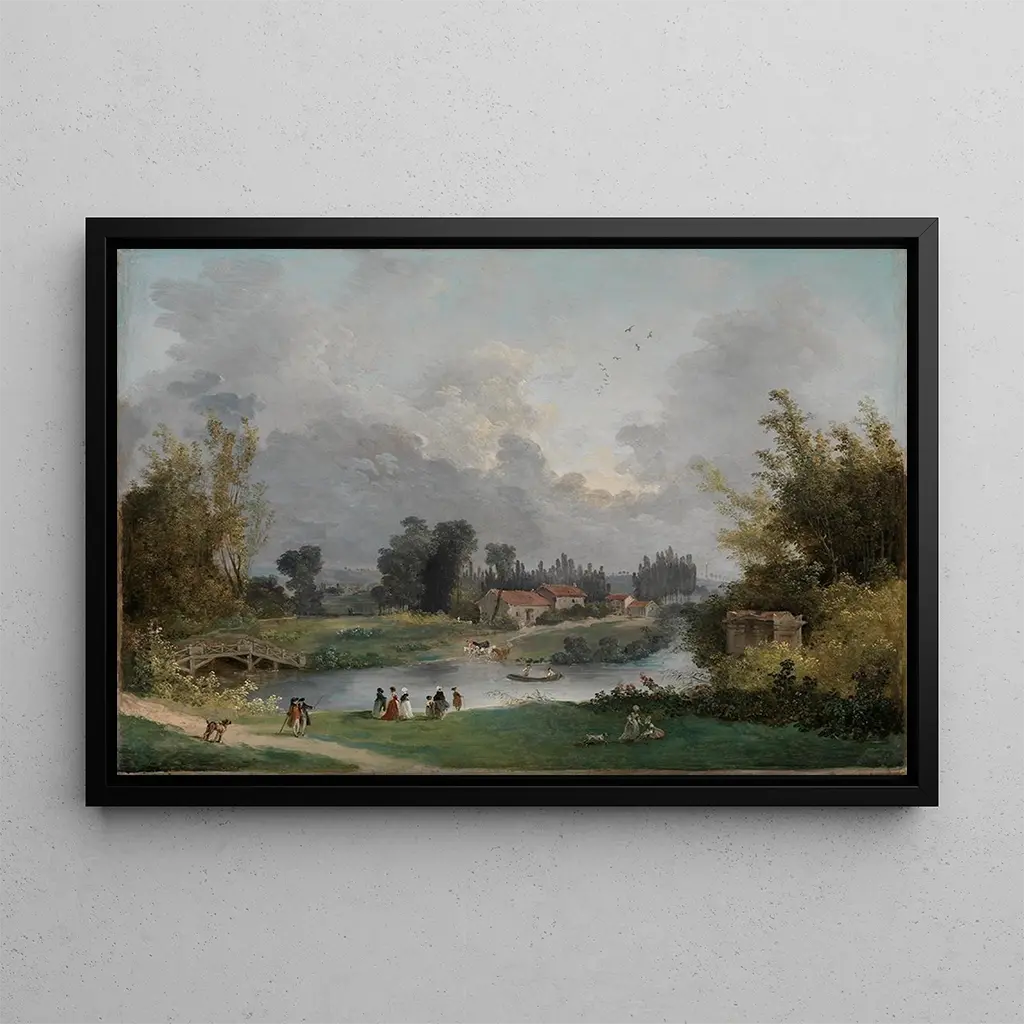 This art print, titled "Landscape of a Park," invites you to immerse yourself in a world of serenity and natural beauty. Hubert Robert, a master of landscape painting, uses a palette of soft and luminous colors, where the vibrant greens of the trees blend with the delicate shades of the sky. The oil painting technique allows for remarkable detail, creating a peaceful and contemplative atmosphere. Natural elements, such as winding rivers and shaded paths, seem to invite the viewer to stroll through them, to feel the coolness of the air and the gentle light.