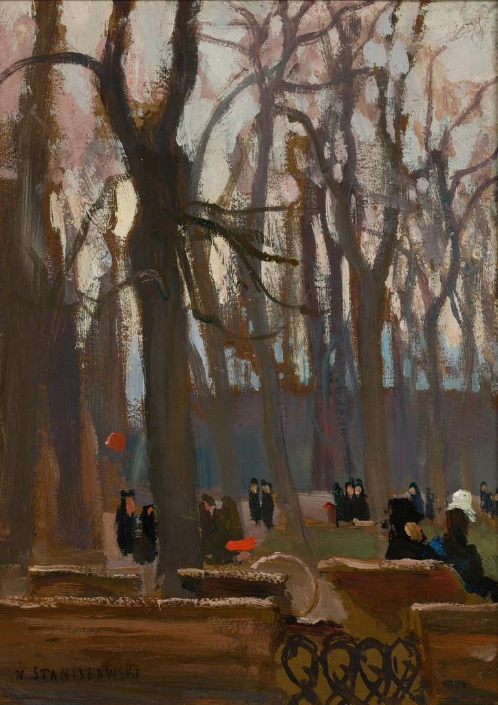 Jan Stanisławski, born in Poland at the end of the 19th century, is recognized for his innovative approach to landscape. Influenced by Impressionism, he developed a style that emphasizes light and color, transforming ordinary scenes into vibrant works of art. His passion for nature and his desire to capture the ephemeral beauty of urban and rural landscapes are evident in his creations. The Fragment of the Planty Park perfectly illustrates his talent for immortalizing moments of life, while reflecting the importance of nature in the daily life of city dwellers.