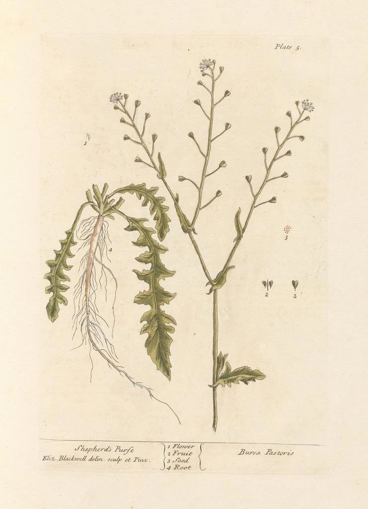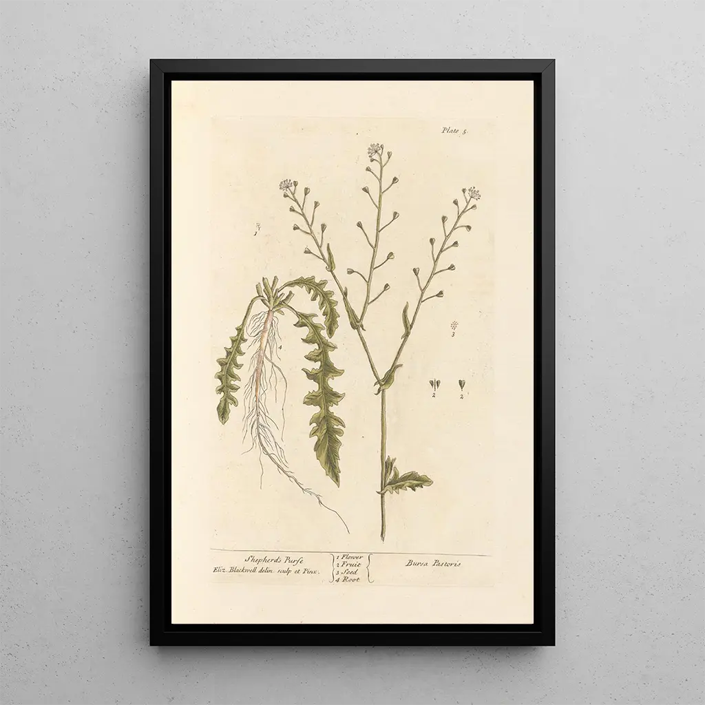 The art print "Bourse-à-pasteur" by Elizabeth Blackwell is a captivating illustration that highlights the delicacy of this plant. The meticulous details and soft colors reveal an artistic approach imbued with poetry. Each element of the composition, from the leaves to the flowers, is carefully depicted, creating a soothing and harmonious atmosphere. This piece invites visual exploration, where the beauty of nature unfolds with grace and subtlety.