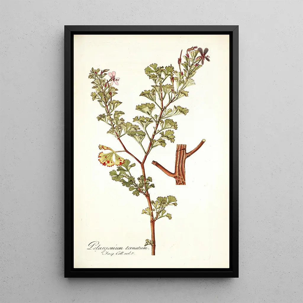 The art print of Pelargonium ternatum immerses us in a rich botanical universe full of details. This painting, created with remarkable precision, highlights the delicate nuances of the leaves and flowers of this plant. The vibrant colors, ranging from bright green to soft pink, create an atmosphere that is both soothing and invigorating. The watercolor technique, combined with fine line work, brings each petal to life, making the piece almost tangible. The artist manages to capture the very essence of nature, inviting the viewer to an attentive and respectful contemplation.