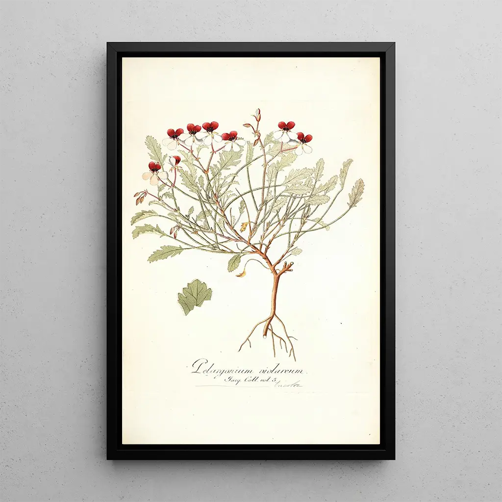 Pelargonium violareum: a tribute to floral nature The art print Pelargonium violareum, created by Nikolaus Joseph Freiherr von Jacquin, is a true celebration of botanical beauty. This captivating piece, painted with meticulous attention to detail, features vibrant colors that evoke the freshness of gardens. The shades of green, pink, and white intertwine harmoniously, creating an atmosphere that is both soothing and invigorating. The watercolor technique, used with finesse, captures the delicacy of the petals and the texture of the leaves, inviting the viewer to immerse themselves in a rich and lush floral universe. Nikolaus Joseph Freiherr von Jacquin: a pioneer of artistic botany Nikolaus Joseph Freiherr von Jacquin, botanist and artist of the 18th century, played a key role in scientific illustration of plants. His work aligns with the naturalism movement, characterized by a faithful representation of nature. Influenced by the botanical discoveries of his time, Jacquin mastered the blend of science and art, creating works that are both informative and aesthetic. His illustrations, such as Pelargonium violareum, reflect an era when the exploration of exotic plants fascinated scientists and artists alike, making him a prominent figure in the history of botanical art. A decorative acquisition with multiple advantages The art print of Pelargonium violareum is an ideal choice to enhance your interior, whether in a living room, office, or bedroom. Its print quality and fidelity to the original colors make it a distinguished decorative piece. This artwork brings a touch of nature and serenity to your space, while also inspiring admiration from visitors. With its undeniable aesthetic appeal, this canvas is not only a decorative addition but also an invitation to appreciate the beauty of plants and to celebrate the creativity of botanical art.