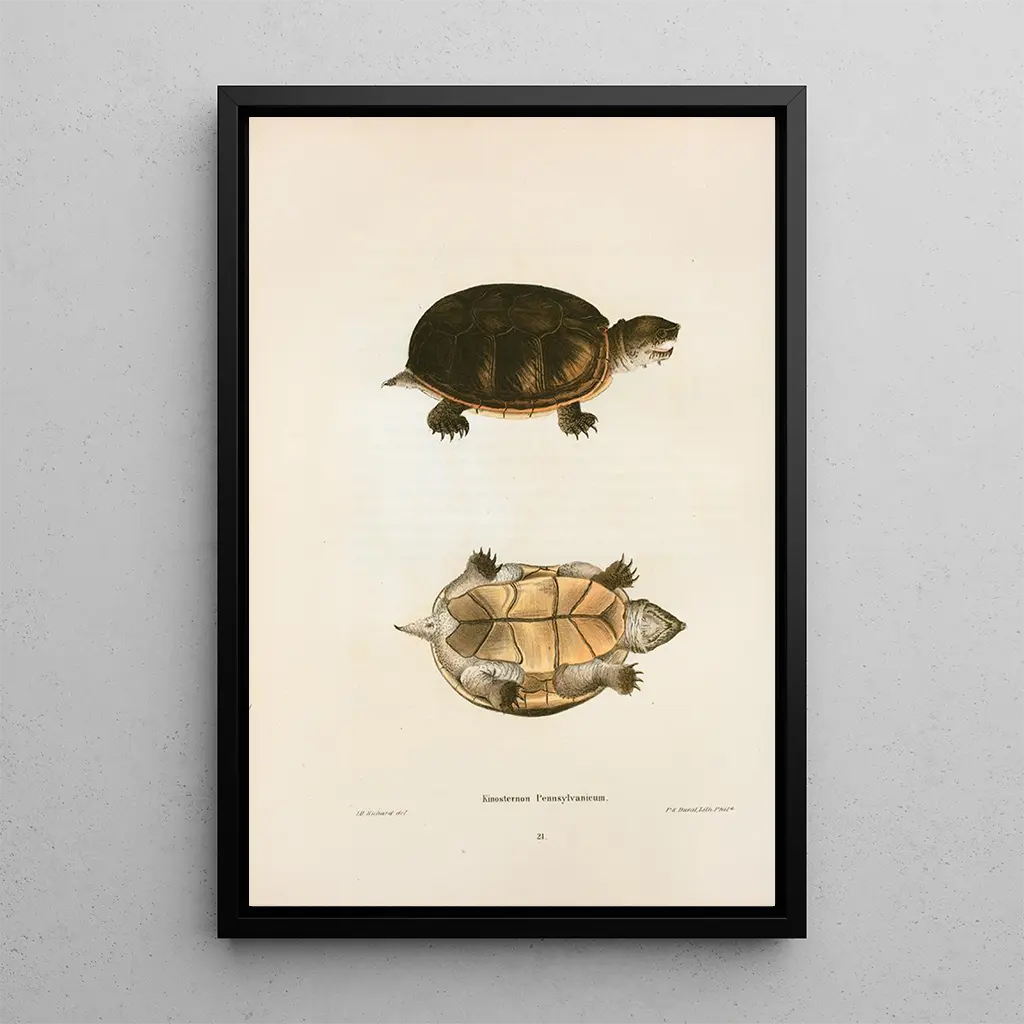 The reproduction of the art print Kinosternon de Pennsylvanie is a decorative piece that will enhance any space, whether a living room, an office, or a bedroom. Its print quality and fidelity to the original colors make it an ideal choice for nature and biodiversity enthusiasts. By integrating this art print into your decor, you bring a touch of elegance and serenity, while celebrating the beauty of the aquatic world. This canvas, with its undeniable aesthetic appeal, is an excellent way to raise awareness about species preservation and the importance of our natural environment.
