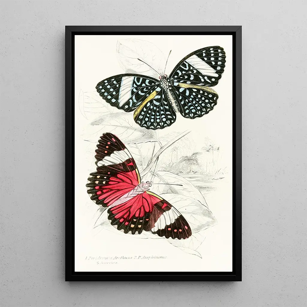 The art print of Peridromia Arethusa Peridromia Amphinome evokes an aerial ballet where vibrant colors blend harmoniously. Shades of blue, green, and orange intertwine to create a lively and joyful atmosphere. The technique used by James Duncan, with delicate and precise brushstrokes, brings these ephemeral creatures to life, capturing their fleeting essence. Every detail, from translucent wings to delicate patterns, invites awe-inspired contemplation, transporting the viewer to a world where nature expresses itself with brilliance.