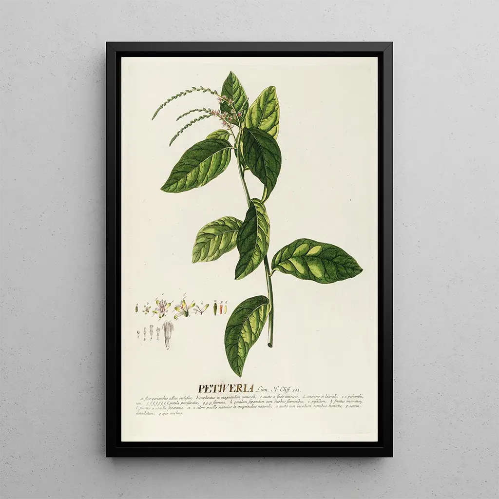 The art print of Petiveria, an iconic work by Georg Dionysius Ehret, immerses us in an extraordinary botanical universe. The meticulous details of the leaves and flowers, rendered with remarkable precision, evoke the delicacy of nature. The vibrant colors, ranging from bright green to deep violet, create a lively and dynamic atmosphere. This canvas, created with a refined engraving technique, invites attentive observation, revealing the hidden beauty of plants. Each element seems to tell a story, a dance between light and shadow, captivating the eye and the mind.