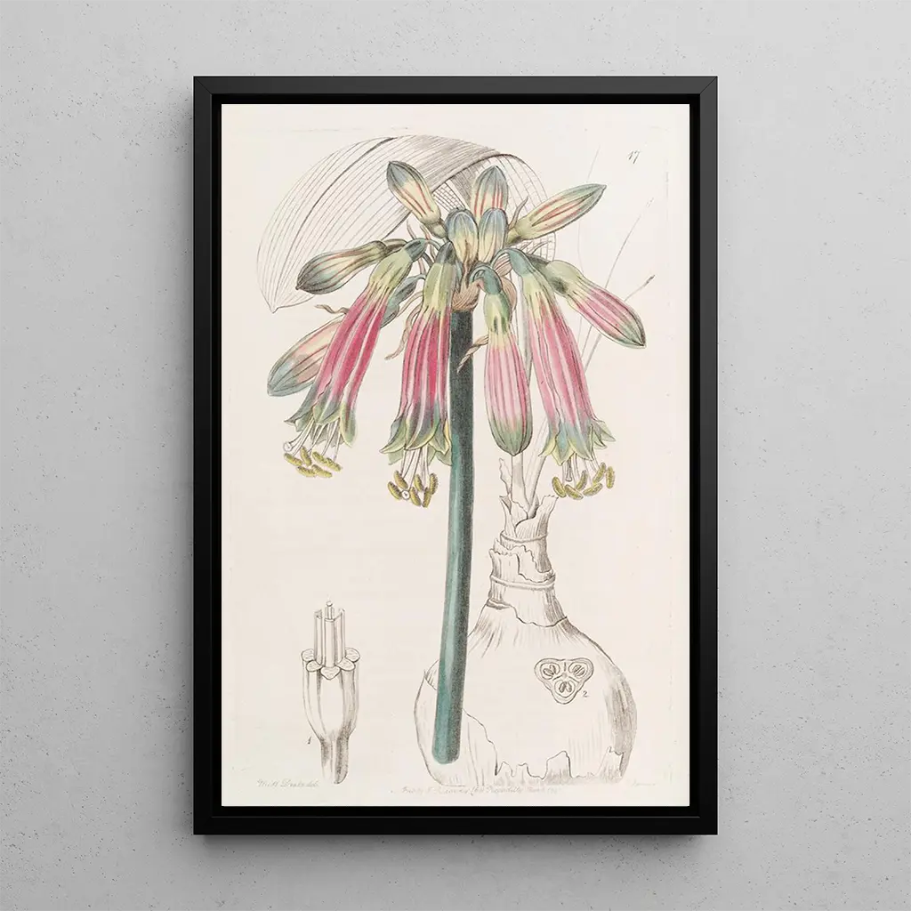 The art print of Phaedranassa crimson and green is an ideal decorative piece to enhance your interior, whether in a living room, office, or bedroom. Its print quality and fidelity to the original colors make it an attractive choice for art and nature enthusiasts. This canvas adds a touch of freshness and elegance, while inspiring admiration from your guests. By choosing this artwork, you opt for a decorative element that combines aesthetics and history, transforming your space into a true haven of peace.