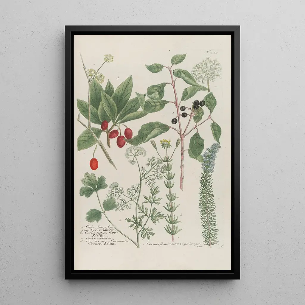 The art print of Phytanthoza iconographia Pl152 transports us into a lush world where each plant is carefully highlighted. Johann Wilhelm Weinmann, through this work, offers us a detailed and colorful vision of botany. The vibrant nuances and delicate shapes of the plants create a lively and dynamic atmosphere. The aquatint technique used allows for remarkable precision in rendering every detail, making this canvas a true masterpiece of botanical illustration. It is an invitation to discover the natural beauty that surrounds us.