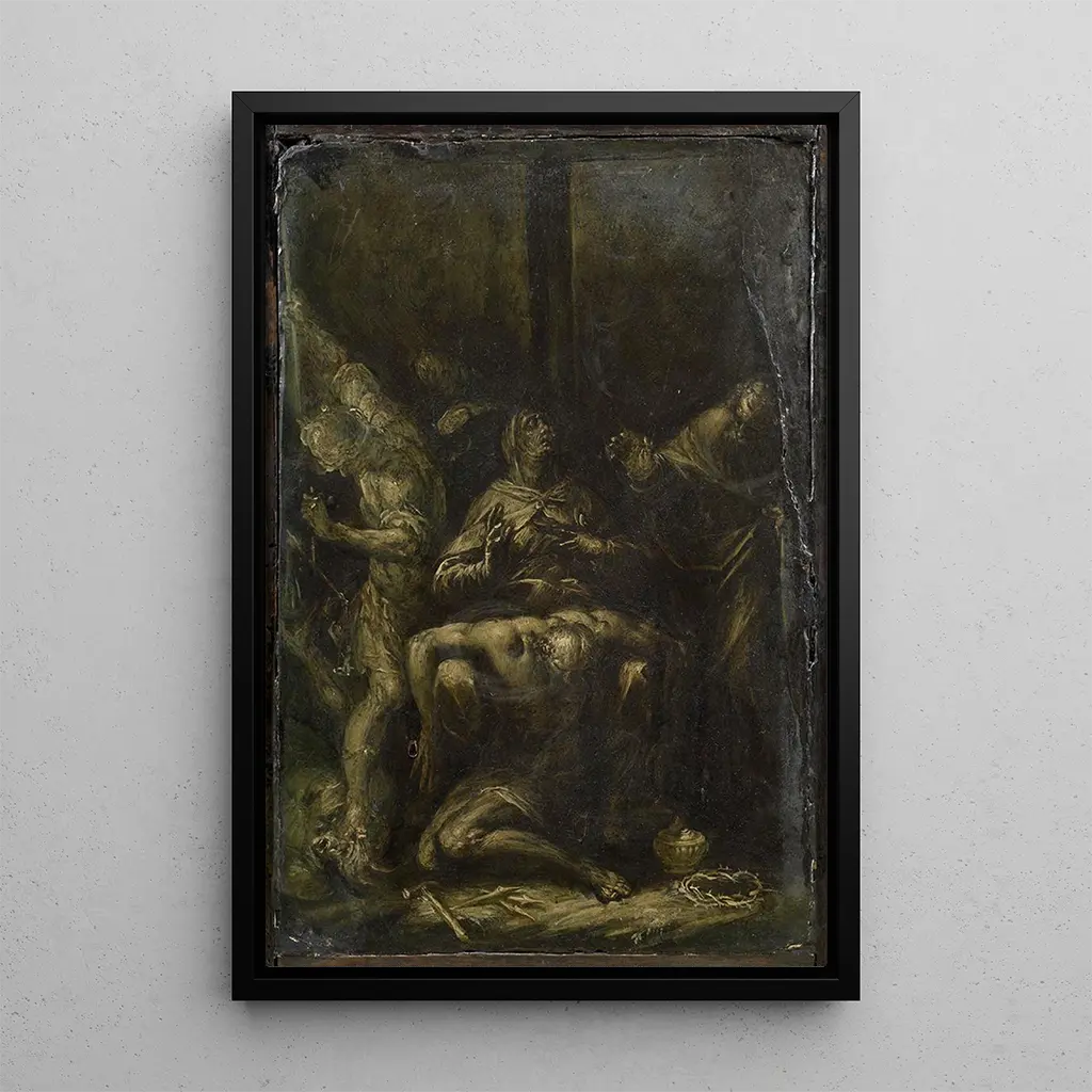 La Piéta d'Isidoro Bianchi évoque une profonde émotion par sa composition poignante. La scène représente la Vierge Marie tenant le corps sans vie de Jésus, capturant un moment de douleur et de tendresse. Les couleurs sombres et terreuses dominent, accentuant l'atmosphère de tristesse et de recueillement. La technique de Bianchi, mêlant réalisme et expressionnisme, permet de ressentir l'intensité des sentiments des personnages. Chaque détail, des traits du visage aux plis des vêtements, est soigneusement travaillé pour transmettre une humanité palpable, invitant le spectateur à une contemplation introspective.
