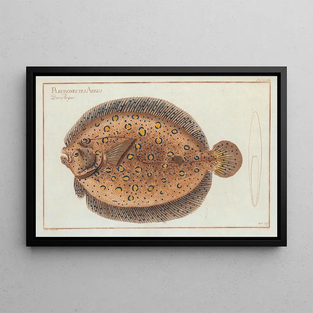Marcus Elieser Bloch, born in 1723, was a German naturalist and illustrator, renowned for his contributions to the study of fish. His major work, "Naturgeschichte der ausländischen Fische," marked a turning point in scientific illustration, blending rigor and aesthetics. Bloch traveled across Europe and beyond, collecting specimens and conducting detailed studies. His innovative approach helped deepen understanding of marine biodiversity, and his works continue to inspire biology and art enthusiasts. The art print of Pleuronectes argus bears witness to his legacy and impact on art and science.