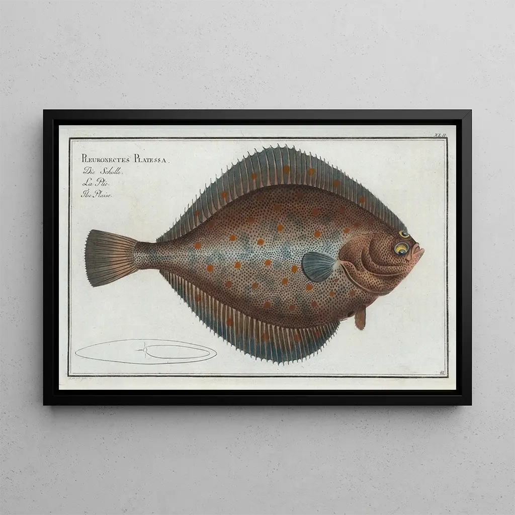Pleuronectes platessa, the plaice: a study of aquatic nature In "Pleuronectes platessa, the plaice," Marcus Elieser Bloch offers us a fascinating depiction of this flat fish, emblematic of European coasts. The canvas highlights the delicate details of the plaice's skin, with its shades of beige and brown, blending harmoniously into its aquatic environment. The engraving technique used by Bloch captures the texture and subtleties of this fish's anatomy, while evoking a peaceful and contemplative atmosphere. This artwork is a true ode to marine biodiversity. Marcus Elieser Bloch: a naturalist dedicated to art Marcus Elieser Bloch, born in 1723, was a German artist and naturalist whose work had a significant impact on zoological illustration. Active in the 18th century, he is best known for his works on fish, which combine scientific precision with artistic sensitivity. His meticulous approach and attention to detail make him a pioneer in the field of naturalist illustration. Through his works, Bloch contributed to the understanding of aquatic fauna while raising public awareness of the beauty of marine species. A decorative acquisition with multiple assets The art print of "Pleuronectes platessa, the plaice" is an ideal decorative choice for lovers of nature and marine life. Whether in a kitchen, dining room, or office, this canvas adds a touch of originality and elegance. Its reproduction quality ensures fidelity to the details and colors of the original work, allowing you to enjoy a soothing and inspiring atmosphere. With its aesthetic appeal, this piece becomes a focal point that sparks curiosity and admiration among visitors.