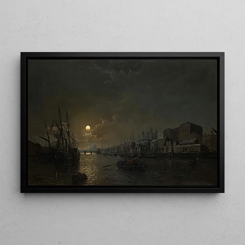 The art print "Port of London" by Henry Pether vividly captures the bustling activity of a lively port. The white sails of the boats blend with the warm hues of the sunset sky, creating an atmosphere that is both peaceful and dynamic. Pether's technique, combining oil on canvas with a keen sense of detail, brings to life the characters busy on the quay. The reflections in the water add an almost poetic dimension to this piece, inviting the viewer to immerse themselves in the maritime world of the 19th century.