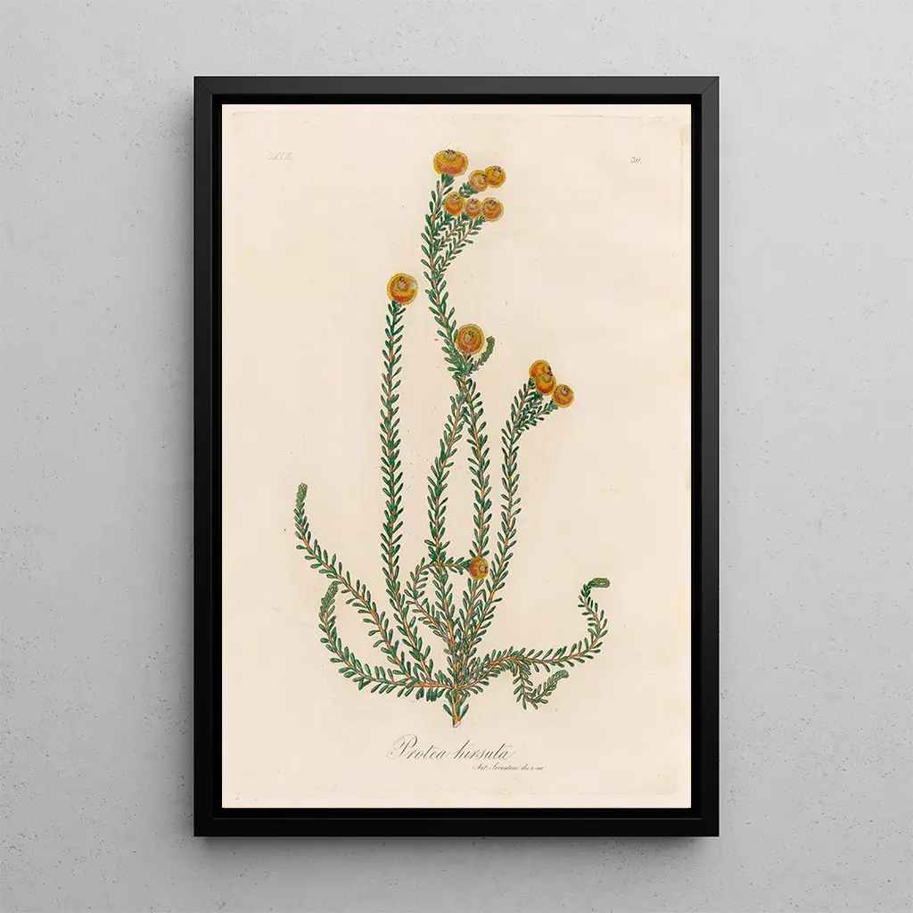Protea hirsuta: an explosion of colors and shapes The art print of Protea hirsuta offers a vibrant vision of this iconic plant. The bright shades of pink and green intertwine harmoniously, creating an atmosphere that is both joyful and soothing. The watercolor technique used by the artist captures the delicacy of the petals and the unique texture of the leaves. Every detail is meticulously rendered, inviting the viewer to delve into the fascinating botanical universe of this species. The piece evokes a sense of freshness and vitality, like a gentle breeze in a lush garden. Gaetano Savi: a pioneer of botanical illustration Gaetano Savi, botanist and artist of the 18th century, marked his era with precise and poetic illustrations. Raised in an environment where science and art intersected, he skillfully combined his botanical knowledge with a keen sense of aesthetics. Savi contributed to the documentation of numerous plant species, playing a vital role in understanding the biodiversity of his time. His work is not only a celebration of nature but also a testament to the importance of scientific observation. His artworks continue to inspire botanical and art enthusiasts. A decorative acquisition with multiple advantages The art print of Protea hirsuta is an ideal decorative piece to enhance any space, whether a living room, office, or bedroom. Its printing quality guarantees exceptional fidelity to the colors and details of the original, while adding a touch of nature to your interior. This captivating poster draws the eye and sparks conversations, creating a warm and welcoming atmosphere. By choosing this canvas, you opt for a decorative element that is both aesthetic and enriching, capable of harmoniously integrating into your interior decor.