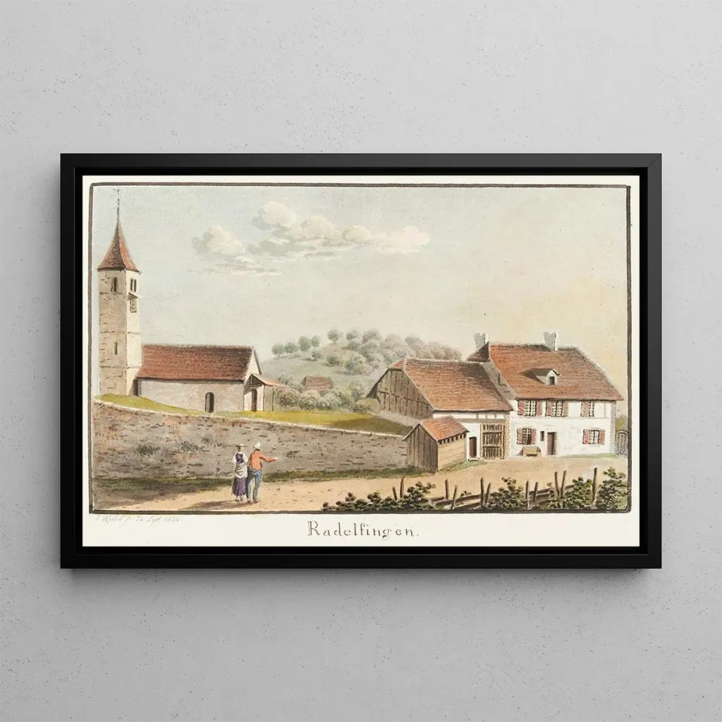 The art print of "Radelfingen" immerses us in a Swiss rural landscape where nature and architecture meet harmoniously. The earthy tones and shades of green evoke the richness of the countryside, while the meticulous details of the buildings add a historical dimension to the scene. Jakob Samuel Weibel, with his realistic style, manages to capture the very essence of daily life in this village, paying homage to the beauty of Swiss landscapes. The peaceful atmosphere emanating from this canvas invites daydreaming and escapism.