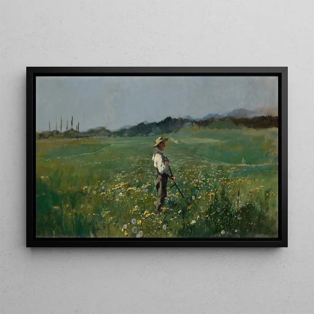 In this art print titled "Faucheur dans un pré fleuri," artist Frank Buchser delicately captures the beauty of rural life. The canvas features a vibrant color palette, where the bright greens of the fields blend with golden touches of flowers. The oil on canvas technique allows for the rendering of textures in the vegetation and the sunlight filtering through the leaves. The atmosphere conveyed by the piece evokes deep serenity, inviting the viewer to immerse themselves in this moment of hard work, while celebrating the beauty of the surrounding nature.