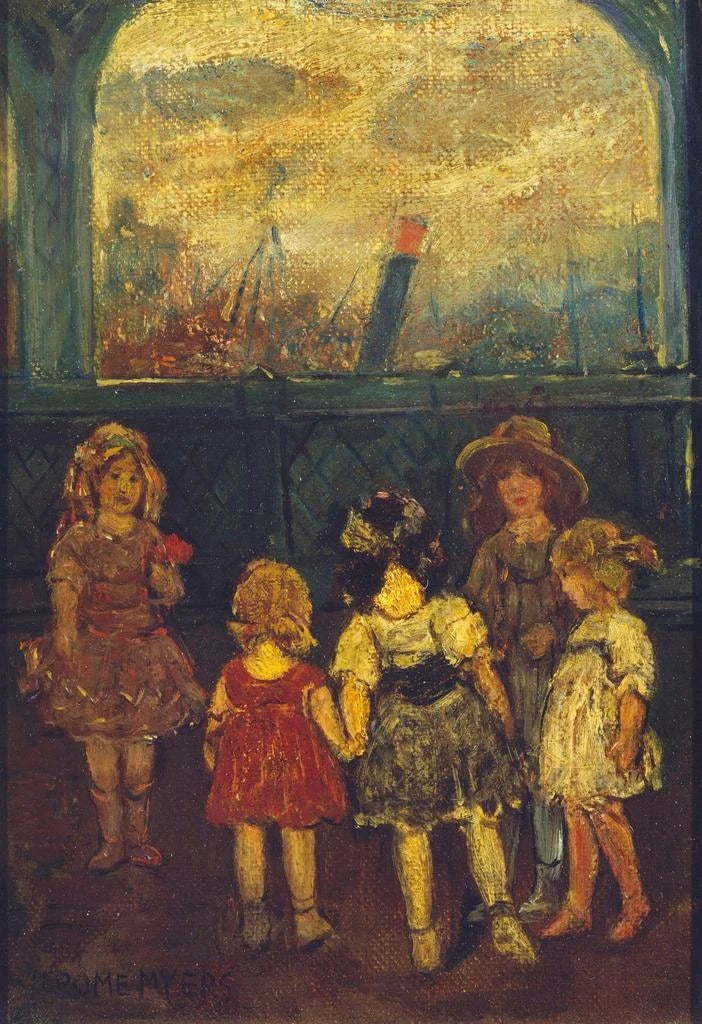 Jerome Myers, active in the early 20th century, is an American artist known for his depictions of urban life and leisure scenes. Influenced by Impressionism, he captured light and movement with a unique sensitivity. His works, often centered on themes of daily life, reflect a period of transition and modernity, where public spaces became places of meeting and exchange. "Quai de récréation" fits perfectly within this approach, demonstrating the importance of social life in the historical context of his time.