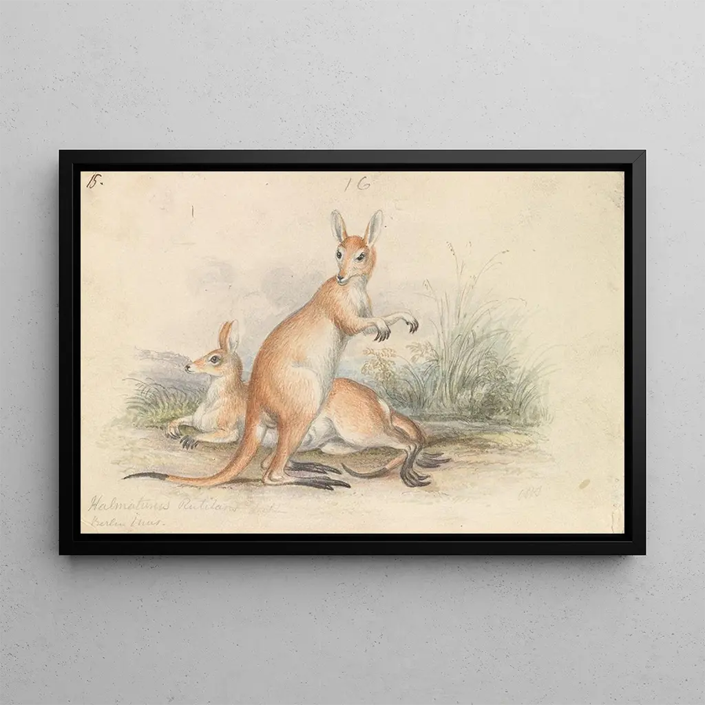 Kangourous Reds: A Wild Dance Under the Australian Sky In this art print of Kangourous Reds, Charles Hamilton Smith captures the very essence of Australian wildlife. The kangaroos, majestic and graceful, seem to leap with an almost aerial lightness. The warm colors of the earth and sky blend harmoniously, creating a vibrant and lively atmosphere. The watercolor technique, used with finesse, brings to life the details of the fur and the texture of the landscape. It evokes an invitation to immerse oneself in this painting, to explore the vast expanses of Australia, while admiring the natural beauty of these iconic creatures. Charles Hamilton Smith: a pioneer of naturalist art Charles Hamilton Smith, active in the early 19th century, is recognized for his contributions to naturalist art. Influenced by his travels and studies of wildlife, he was able to accurately depict animals in their natural habitat. His works, often inspired by scientific expeditions, testify to a time when exploration and discovery were at their peak. As an illustrator and painter, Smith left a lasting legacy, allowing future generations to appreciate the richness of biodiversity. His work on kangaroos, in particular, highlights the importance of conservation and the appreciation of threatened species. A decorative acquisition with multiple advantages Opting for an art print of Kangourous Reds means choosing a decorative piece that will add a touch of exoticism to your interior. Whether in a living room, office, or bedroom, this artwork will captivate attention and spark conversations. Its printing quality guarantees fidelity to the colors and details of the original work, while offering undeniable aesthetic appeal. By adding this canvas to your decor, you not only invite a piece of nature into your home but also pay tribute to art and the wild beauty of Australia.