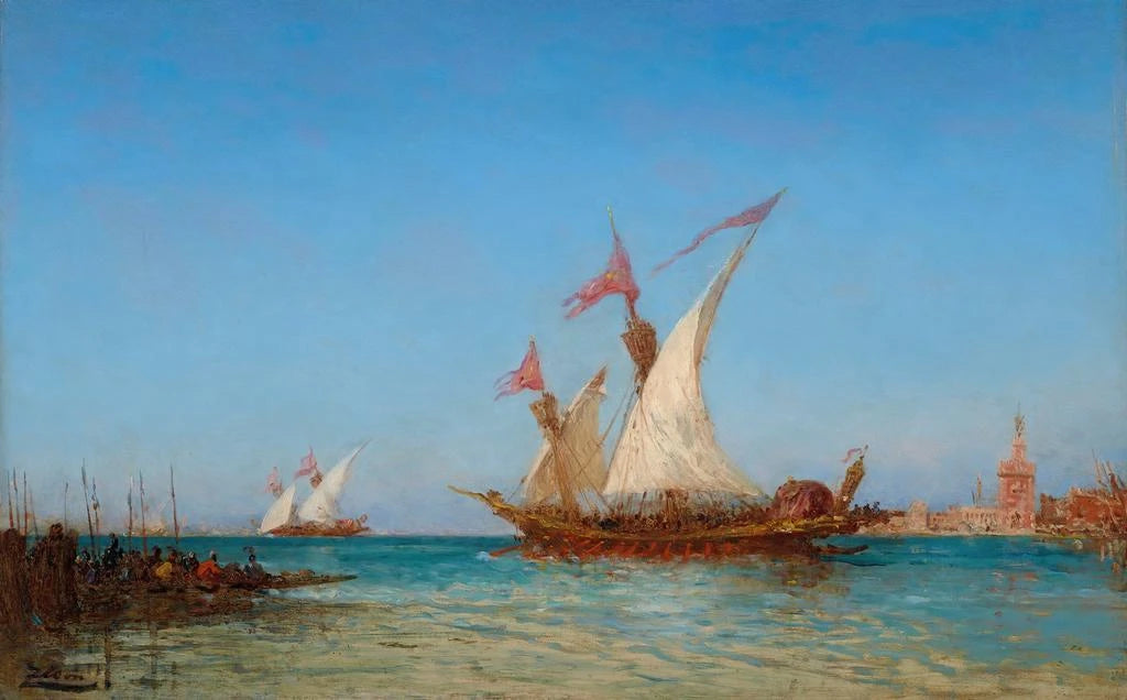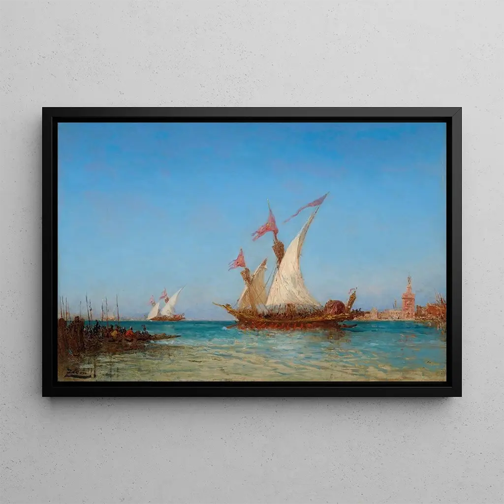 In this iconic art print, Félix Ziem captures the very essence of Venice, where the white sails of boats dance on the shimmering water. The vibrant colors, ranging from deep blues to bright yellows, create a lively and joyful atmosphere. Ziem's technique, blending oil and delicate brushwork, brings each reflection on the water's surface to life. Viewers are invited to immerse themselves in this painting, to feel the gentle breeze, and to admire the spectacle of the regattas, a true homage to the beauty of the Venetian lagoon.