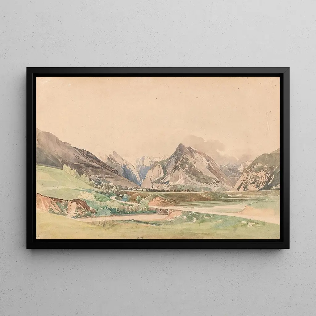 The art print of the canvas "Region near Flitsch" transports us to a calming landscape, where nature flourishes in a palette of greens and blues. The majestic mountains rise in the background, while the soft sunlight caresses the lush valleys. Thomas Ender's technique, blending watercolor and oil, creates an atmosphere of tranquility and harmony. Each brushstroke seems to capture the very essence of this place, inviting the viewer to immerse themselves in this bucolic scene.