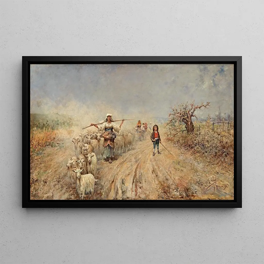 The art print Return of the Herd is a decorative piece that fits perfectly into various environments, whether a living room, dining room, or office. Its quality reproduction and visual appeal make it an ideal choice for those wishing to add a touch of rustic charm to their interior. The canvas, faithful to the original work, allows you to enjoy the beauty of this scene without losing authenticity. By choosing this art print, you bring a warm and welcoming atmosphere to your space, while celebrating the artistic heritage of Rafael Senet y Pérez.