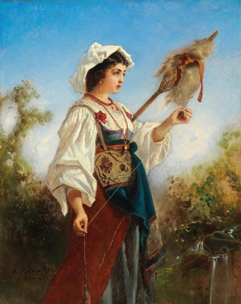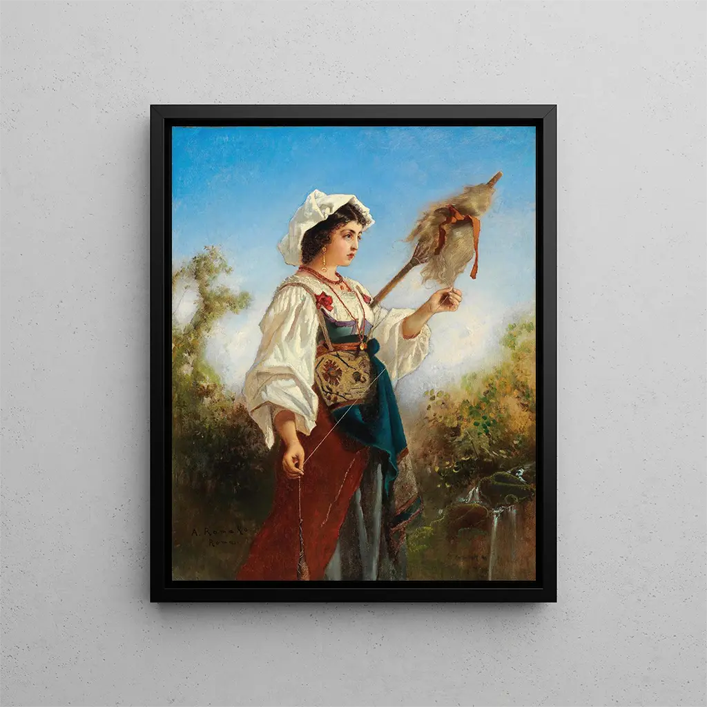 Art print Fileuse romaine - Anton Romako – Introduction captivante Dans le vaste panorama de l'histoire de l'art, certaines œuvres résonnent avec une intensité particulière, capturant non seulement l'imagination des spectateurs, mais aussi l'essence d'une époque. "Fileuse romaine" d'Anton Romako est l'une de ces créations qui transcende le simple cadre d'une peinture pour devenir une immersion dans l'univers de la Rome antique. À travers cette œuvre, l'artiste nous transporte dans un moment suspendu, où le temps semble s'arrêter pour laisser place à la contemplation. La scène dépeint une fileuse au travail, symbole de la vie quotidienne et du labeur féminin, tout en évoquant une beauté intemporelle. Cette peinture, par son réalisme et sa profondeur, invite à une réflexion sur le rôle des femmes dans la société antique, tout en célébrant l'art de la filature, un savoir-faire essentiel à l'époque. Style et singularité de l’œuvre Le style d'Anton Romako se distingue par son attention minutieuse aux détails et sa capacité à capturer la lumière de manière saisissante. Dans "Fileuse romaine", la palette de couleurs choisie par l'artiste évoque une atmosphère chaleureuse, presque intime. Les teintes terreuses, associées à des éclats de lumière, créent une ambiance qui semble vibrer d'une vie propre. La composition est soigneusement équilibrée, mettant en avant la figure de la fileuse tout en intégrant des éléments de son environnement qui enrichissent la narration visuelle. La texture des tissus et la représentation des gestes révèlent une maîtrise technique qui témoigne de l'engagement de Romako envers son art. Chaque coup de pinceau semble chargé de sens, et l'œuvre dans son ensemble se révèle comme une ode à la beauté du quotidien, à l'harmonie entre l'homme et son travail. L’artiste et son influence Anton Romako, peintre d'origine autrichienne, a su s'imposer sur la scène artistique du XIXe siècle grâce à son approche novatrice et à sa sensibilité face aux sujets qu'il choisissait. Influencé par le réalisme et le romantisme, Romako a su marier ces courants pour créer des œuvres qui parlent à l'âme. Sa fascination pour la vie des gens ordinaires, et en particulier pour le rôle des femmes, se retrouve dans plusieurs de ses créations. "Fileuse romaine" s'inscrit parfaitement dans cette démarche,